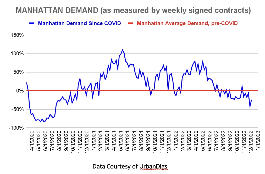 - Supply became markedly overheated during 2021 and some of 2022 and mortgage rates have curbed demand to below pre-pandemic levels, keeping Manhattan in the throes of a strong buyer’s market. Remember, a buyer’s market means that buyers should be rewarded for their patience.