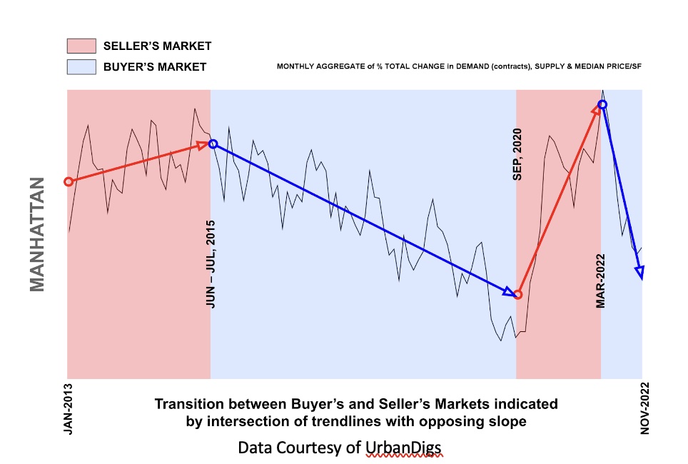 Elegran’s Leverage Indicator informs us whether the current is a buyer’s or a seller’s market; i.e, which party possesses transactional leverage Looking at the graph below, this is indicated by the direction of trend lines. Our indicator also informs us regarding the relative strength of that leverage, indicated by the slope of those trend lines. Per below, Manhattan is in the grips of an exceptionally strong buyer’s market.